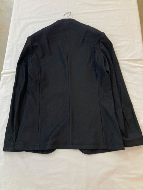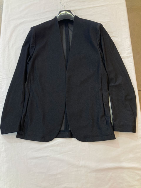 定番エリミネートジャケットの登場です。カットソー仕立てのノーカラー(衿無し)ジャケットですが、デザインしないことをデザインした、まさにシンプルイズベストな趣ある逸品に仕上がりました。腰ポケットも切替えを利用したシームポケットを採用しています。
