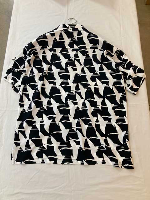 素材はハワイアンシャツ定番生地でハワイアンシャツには最適です。新潟県にて手捺染でプリント加工しています。定番の一つである1PIU1UGUALE3オリジナルの「鶴の群れ」柄を採用しています。
