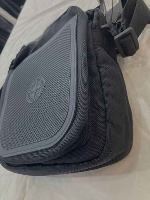 前面にファスナー開閉のベローズポケット、重ねて配したゴム引きの大きなシリコンポケット(1980年代に発表されたStone Islandのウェアアイテムにあしらわれた型押しラバーパッチに着想を得たデザイン)と型押しのワッフルモチーフ、立体的なCompassロゴ。背面に固定フラップとスナップボタンで開閉するポケット。内側にスナップボタン留めのポケット。調節可能なナイロンテープ製のストラップ。上部をファスナーで開閉。